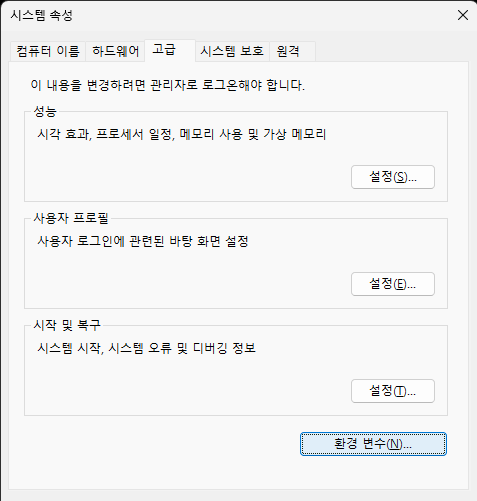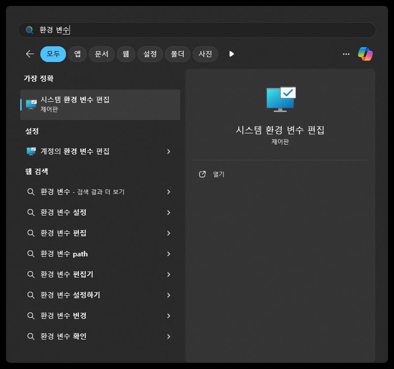 시작 메뉴에서 '환경 변수' 검색해서 '시스템 환경 변수 편집' 선택