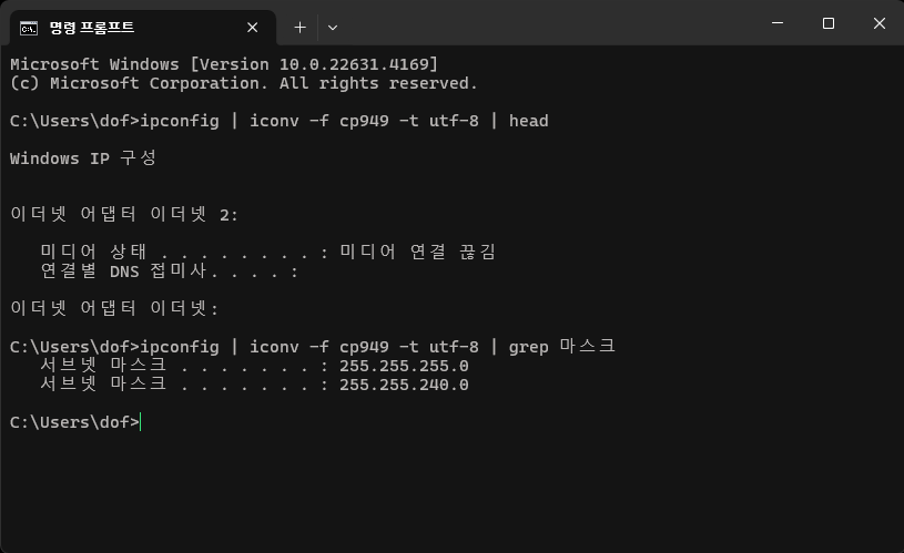ipconfig | iconv -f cp949 -t utf-8 | head